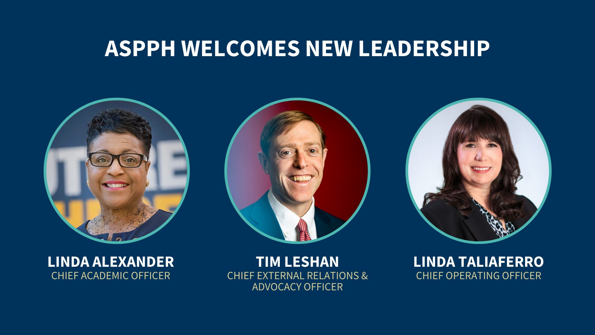 All three appointments bring impressive professional experience and personal vision to ASPPH, and we look forward to their contributions to advancing our Strategic Framework 2030. Welcome to Linda Alexander, Tim Leshan, and Linda Taliaferro!