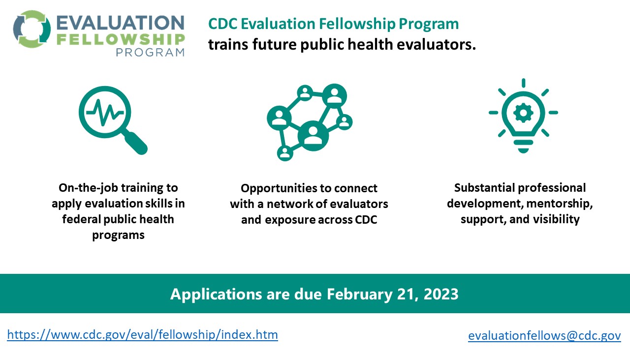 The Centers for Disease Control and Prevention (CDC) Evaluation Fellowship is a two-year training program with masters and doctoral public health fellows placed into CDC host programs working on program evaluation activities. The call for applications closes on Tuesday, February 21, at 11:59 PM ET and a final information session will be held on Friday, February 10, at 12:00 PM ET.