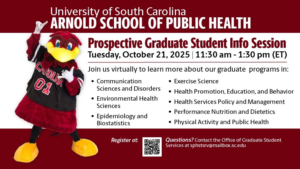 UofSC Arnold School of Public Health Prospective Graduate Student Information Session Tuesday, October 21, 2025 | 11:30 am – 1:30 pm Register at: https://forms.gle/z8gA9NmJDNdc9Kqz9 Join us to learn more about our graduate programs in: Communication Sciences and Disorders; Environmental Health Sciences; Epidemiology and Biostatistics; Exercise Science; Health Promotion, Education, and Behavior; Health Services Policy and Management; Performance Nutrition and Dietetics; and Physical Activity and Public Health.