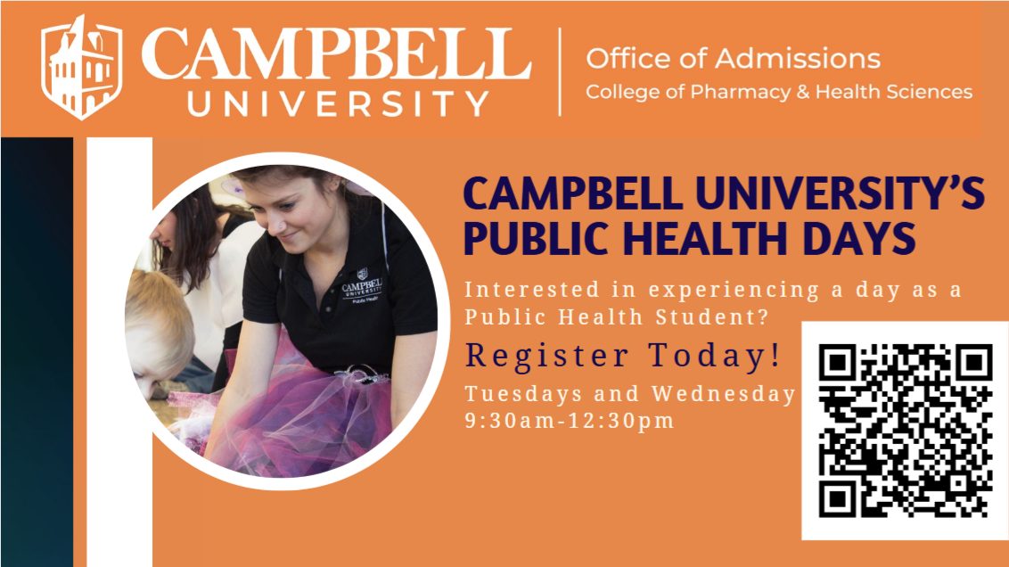 Join us for Public Health Day at Campbell University and experience what it’s like to be part of our program. You’ll sit in on a real class, tour Smith Hall, and meet faculty who are passionate about mentoring future public health leaders. This event is a great way to explore how Campbell prepares students to make an impact in communities through hands-on learning. Don’t miss the chance to picture yourself as a Camel — register today to save your spot! https://cphs.az1.qualtrics.com/jfe/form/SV_cNt3yPSfnGFV4DY