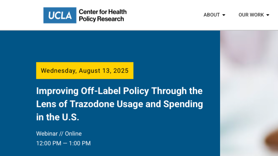 Join us on Wednesday, August 13, as researchers share findings from their study and discuss policy solutions. In a new study published in Health Affairs Scholar, UCLA Center for Health Policy Research Senior Economist Dr. Srikanth Kadiyala, and co-authors look at the uses of trazodone, a drug approved in 1981 to treat depression, as a case study to examine broader issues surrounding off-label use and spending. Although only approved to treat depression, trazodone is often prescribed off-label to treat insomnia and anxiety.