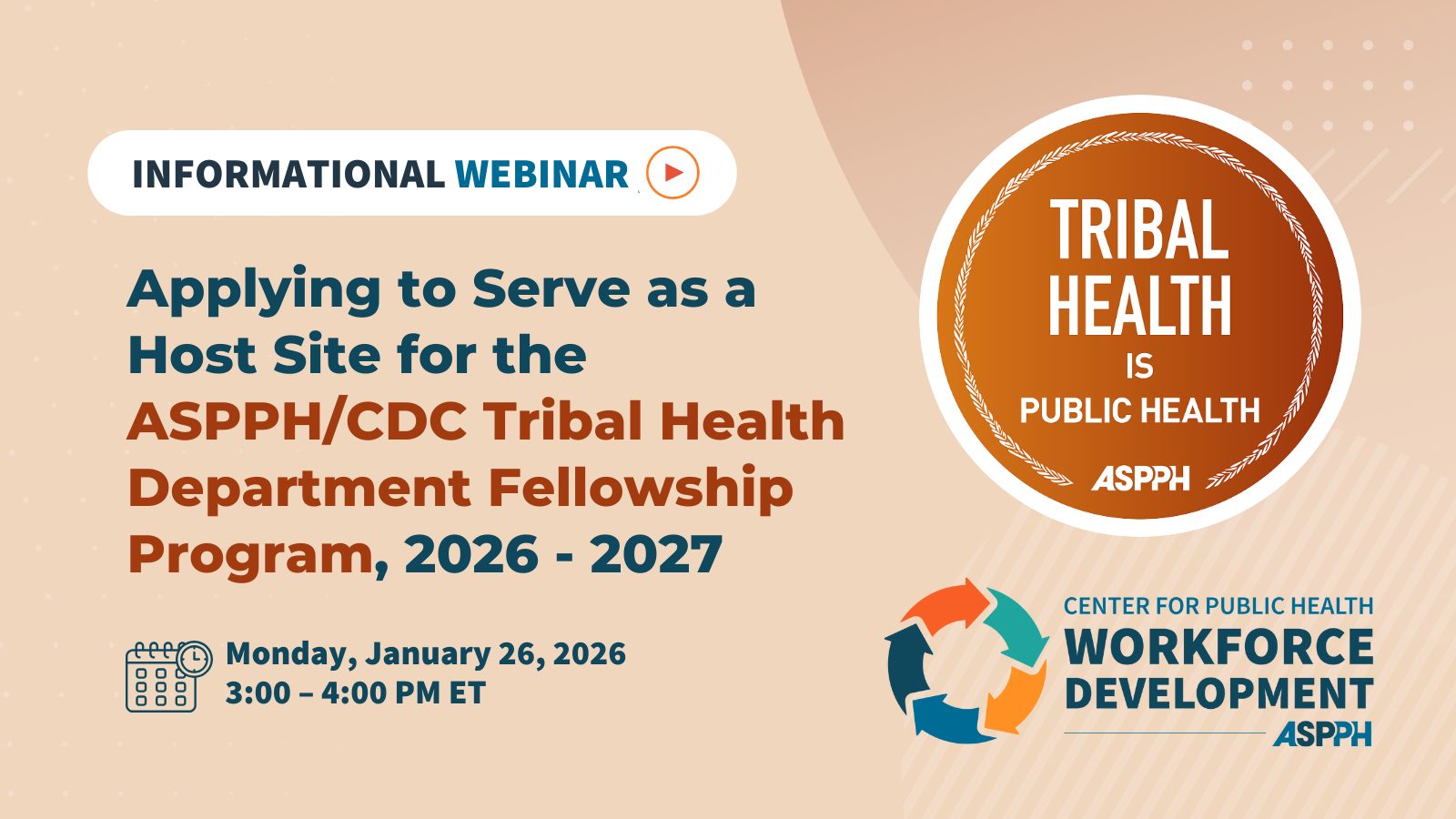 This informational webinar was for Tribal Health Departments and federally recognized Tribes interested in hosting an ASPPH/CDC Tribal Health Department Fellow from September 1, 2026 – July 31, 2027. The fellowship program builds Tribal public health capacity by placing MPH-trained fellows in Tribal Health Departments for an 11-month, full-time applied learning and training experience aligned with Tribal priorities.