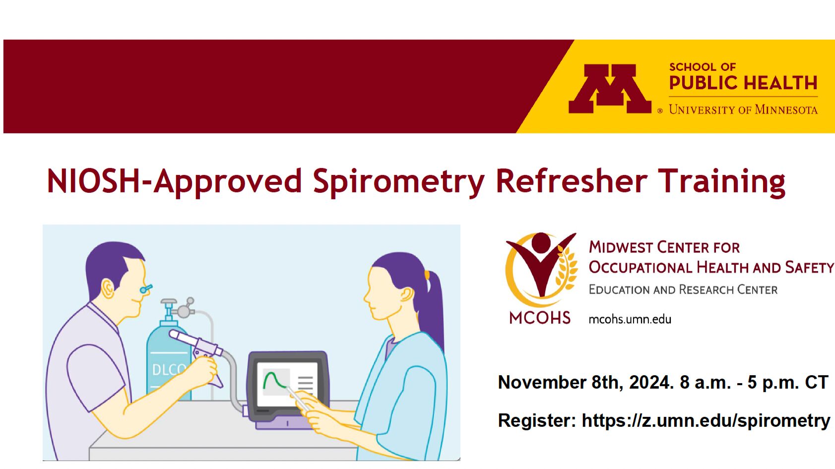 This one-day, interactive course is designed as an update for those who have successfully completed the initial NIOSH-Approved Spirometry Training within the past five years and can provide a copy of that training certificate to the course director. In this interactive workshop, an emphasis will be placed on practical aspects of spirometric testing and making sense of spirometric results. Students are encouraged to supply information on the spirometers they currently or plan to use and samples of spirograms from their work setting. The registration fee of $295.00 includes handouts, course materials, and CEU certificate. This is a NIOSH-Approved course.