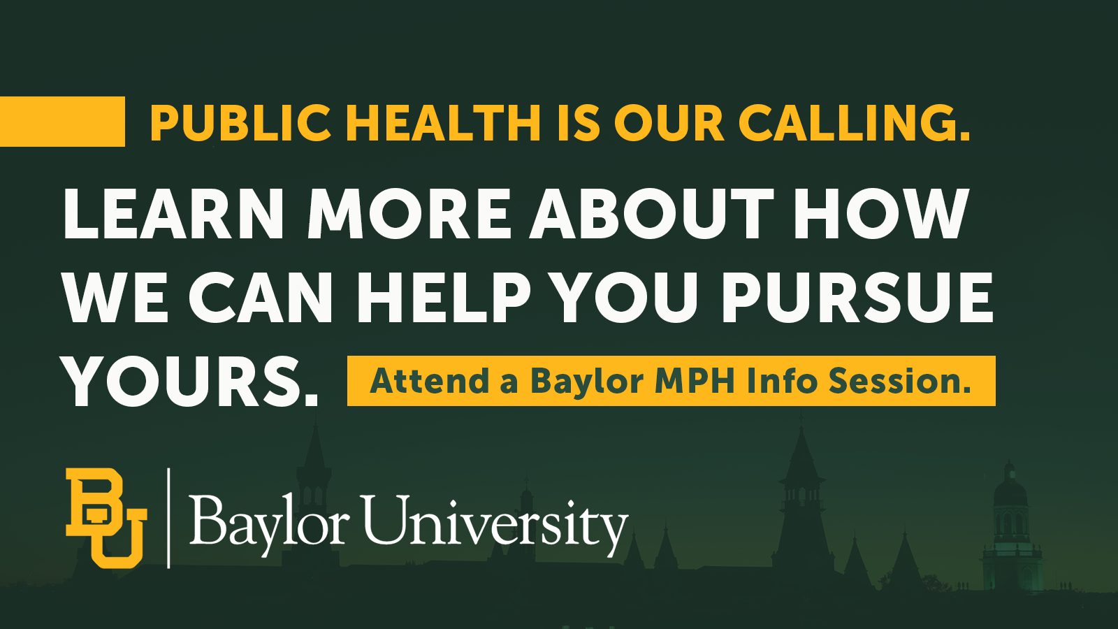 Join our virtual info session for prospective students to explore Baylor’s graduate public health programs. Learn about program options, admissions updates, and next steps—plus get your questions answered by our team.