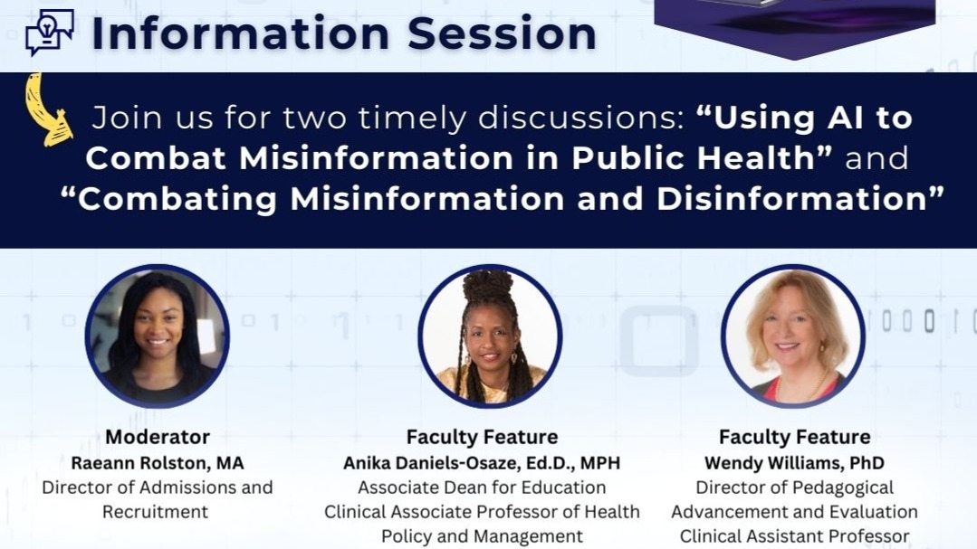 Our next SUNY Downstate School of Public Health Virtual Info Session will focus on “Combating Misinformation and Disinformation” and “Using AI to Combat Misinformation in Public Health.” Learn how to identify, debunk, and combat false information. How to use AI to combat misinformation in public health.