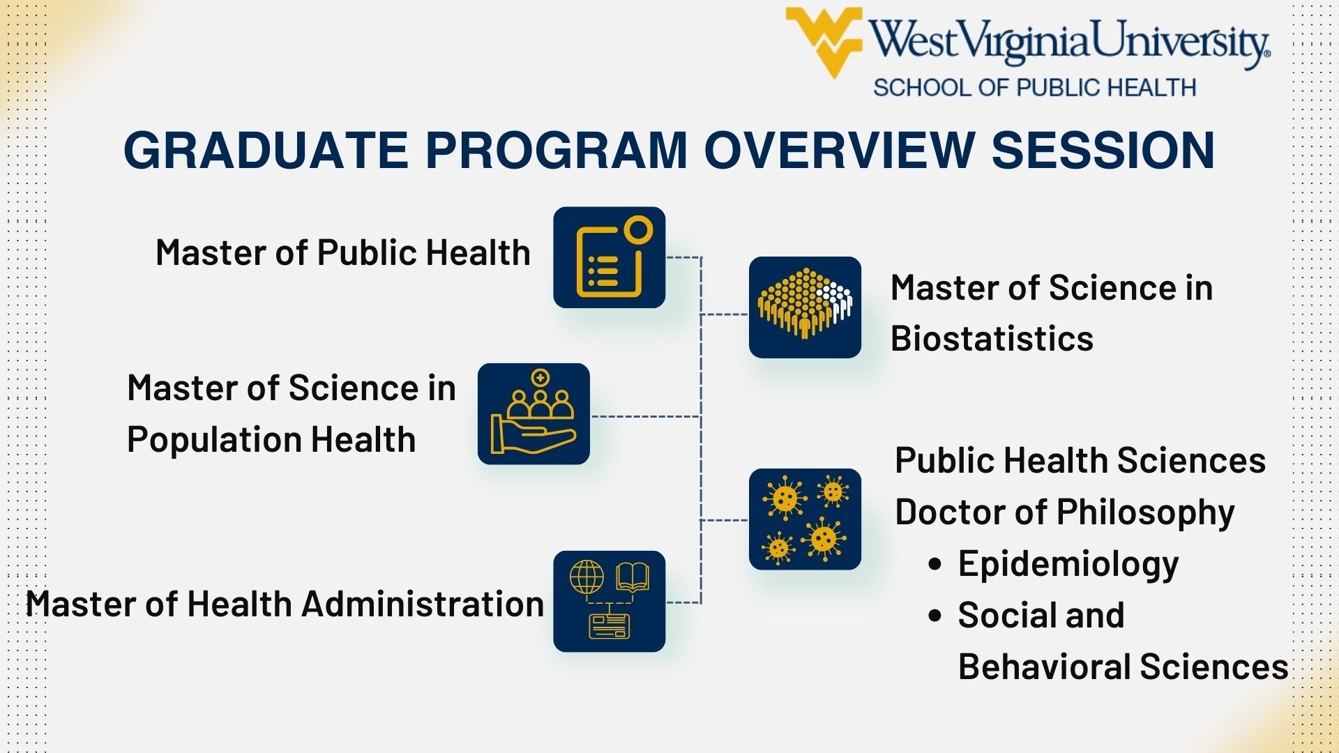 Join us to learn about the graduate programs at the WVU School of Public Health! Our graduate programs include: Master of Public Health (residential or online), Master of Science in Population Health (online), Master of Health Administration (residential or online), Master of Science in Biostatistics (residential), and PhD in Epidemiology or Social and Behavioral Sciences. Register at the URL provided to receive the meeting link!