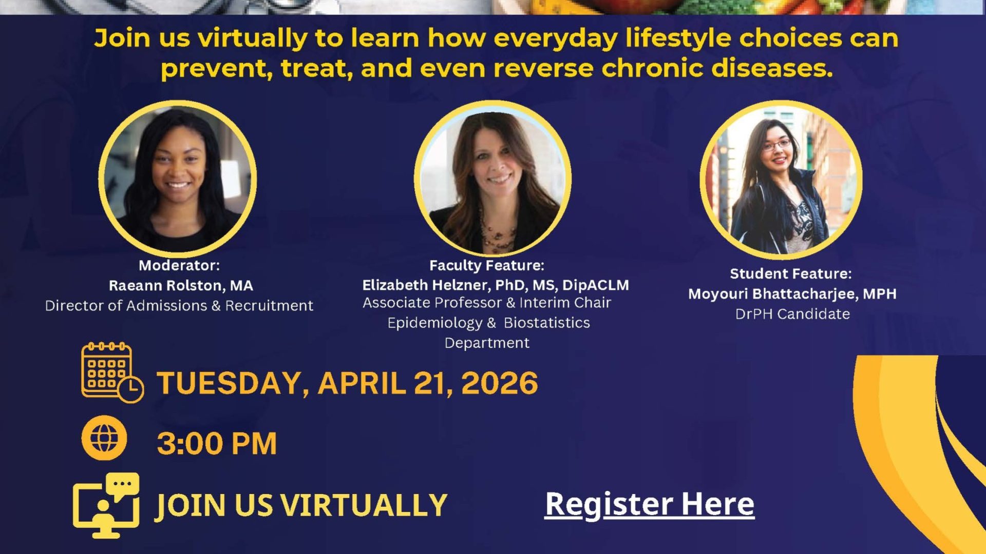 Are you interested in learning how everyday lifestyle choices can prevent, treat, and even reverse chronic diseases? Join SUNY Downstate SPH for an engaging session introducing students to the foundations of Lifestyle Medicine— a growing field focused on using evidence-based behavioral interventions to improve health outcomes and quality of life. Learn more about the admissions