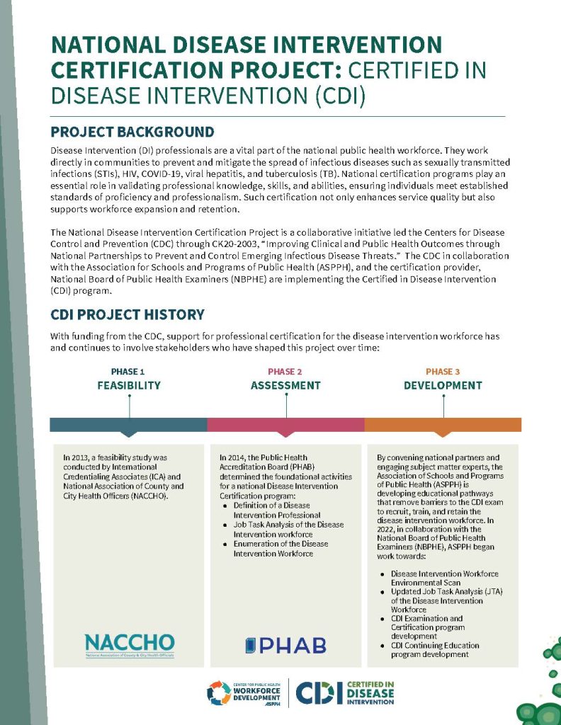 The National Disease Intervention Certification Project is a collaborative initiative led by the Centers for Disease Control and Prevention (CDC) through CK20-2003, “Improving Clinical and Public Health Outcomes through National Partnerships to Prevent and Control Emerging Infectious Disease Threats.” The Center and the selected certification provider, National Board of Public Health Examiners (NBPHE), is implementing the Certified in Disease Intervention (CDI) program.