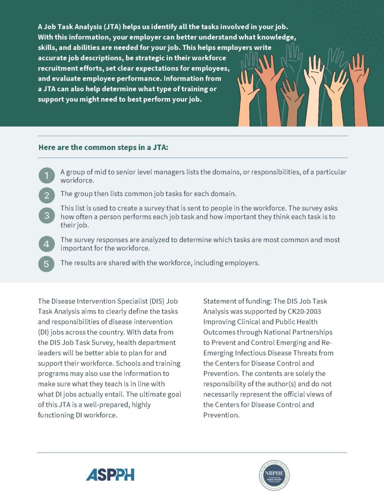 ASPPH is working with the National Board of Public Health Examiners to develop the National Certified in Disease Intervention (CDI) Program that will improve public health and clinical outcomes to prevent and control emerging and re-emerging infectious disease threats through the development of national practice standards and core competencies of the disease intervention workforce. An important step in developing the national CDI program is performing a job task analysis, which systematically identifies and documents the responsibilities associated with a particular job or role within an organization to inform certification examination development.