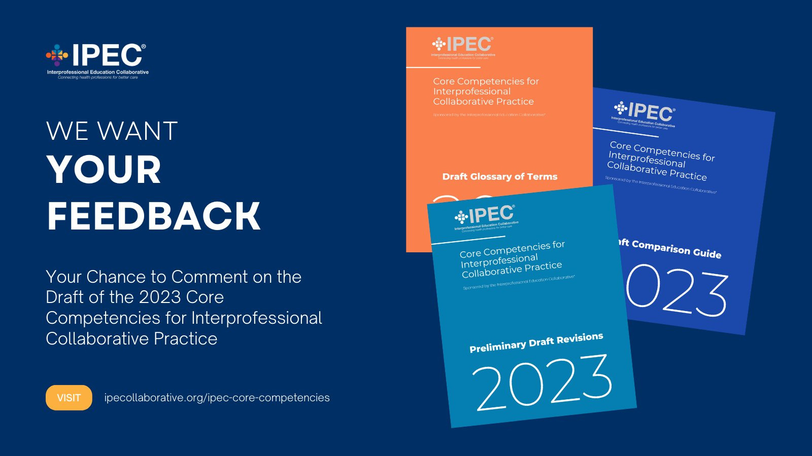 The Interprofessional Education Collaborative (IPEC) has released a preliminary draft of proposed revisions to the IPEC Core Competencies for Interprofessional Collaborative Practice: 2016 Update and welcomes open feedback. A comparison guide (indicating proposed changes to the current, 2016 competency framework) and a glossary of terms referenced in the new draft competencies are also available for viewing.