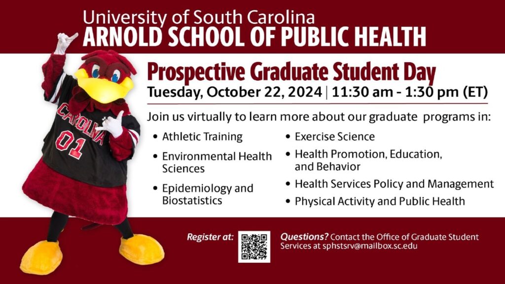University of South Carolina Arnold School of Public Health Prospective Graduate Student Day Tuesday, October 22, 2024 | 11:30 am – 1:30 pm (ET) Join us virtually to learn more